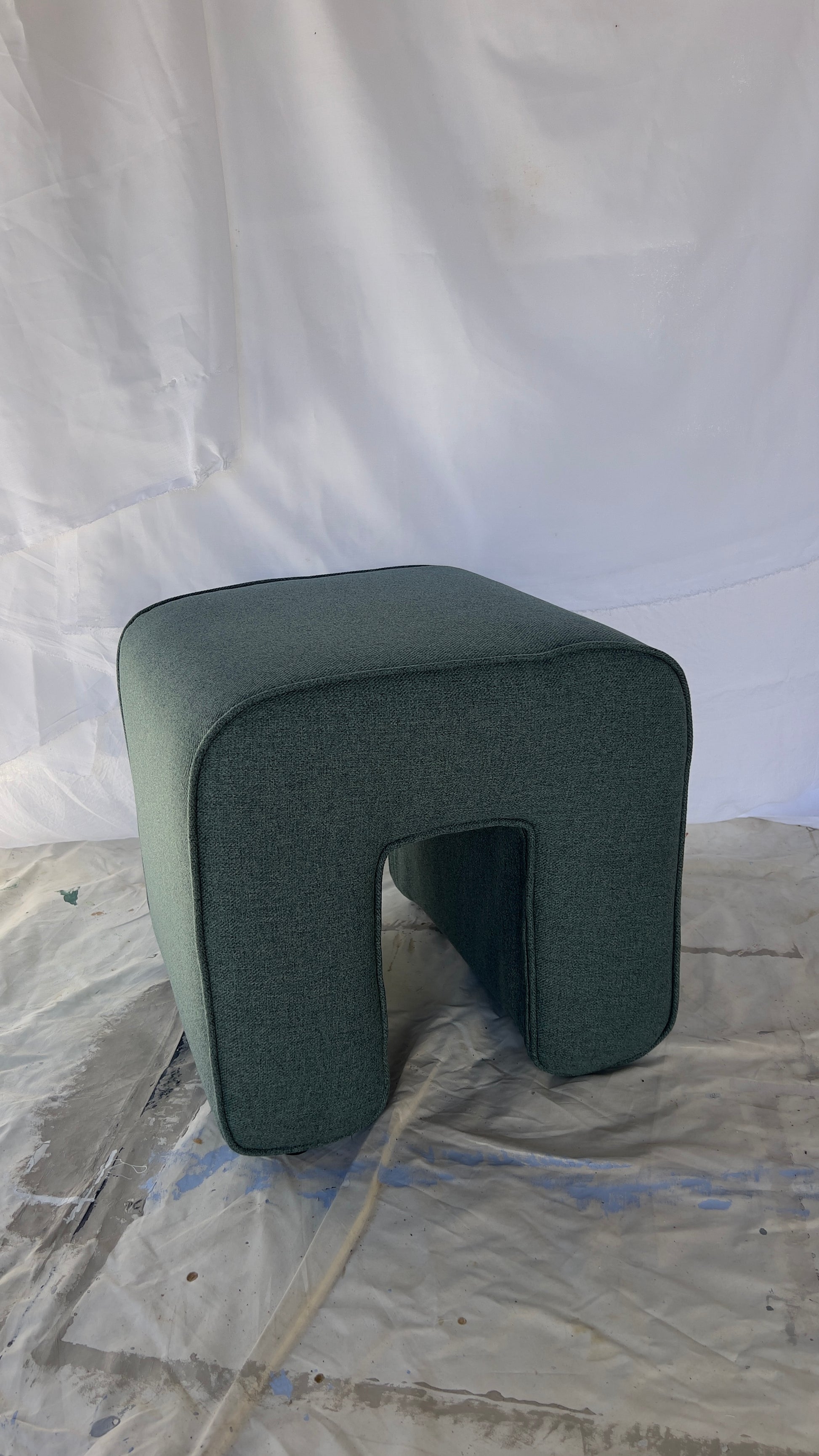 A sculptural pouffe by Danish brand Hübsch, with a bold rounded silhouette and refined simplicity. Upholstered in soft green fabric with supportive foam filling, it works as a footstool, extra seat, or plinth for books and objects. Compact yet striking — sourced from overseas, not sold locally.