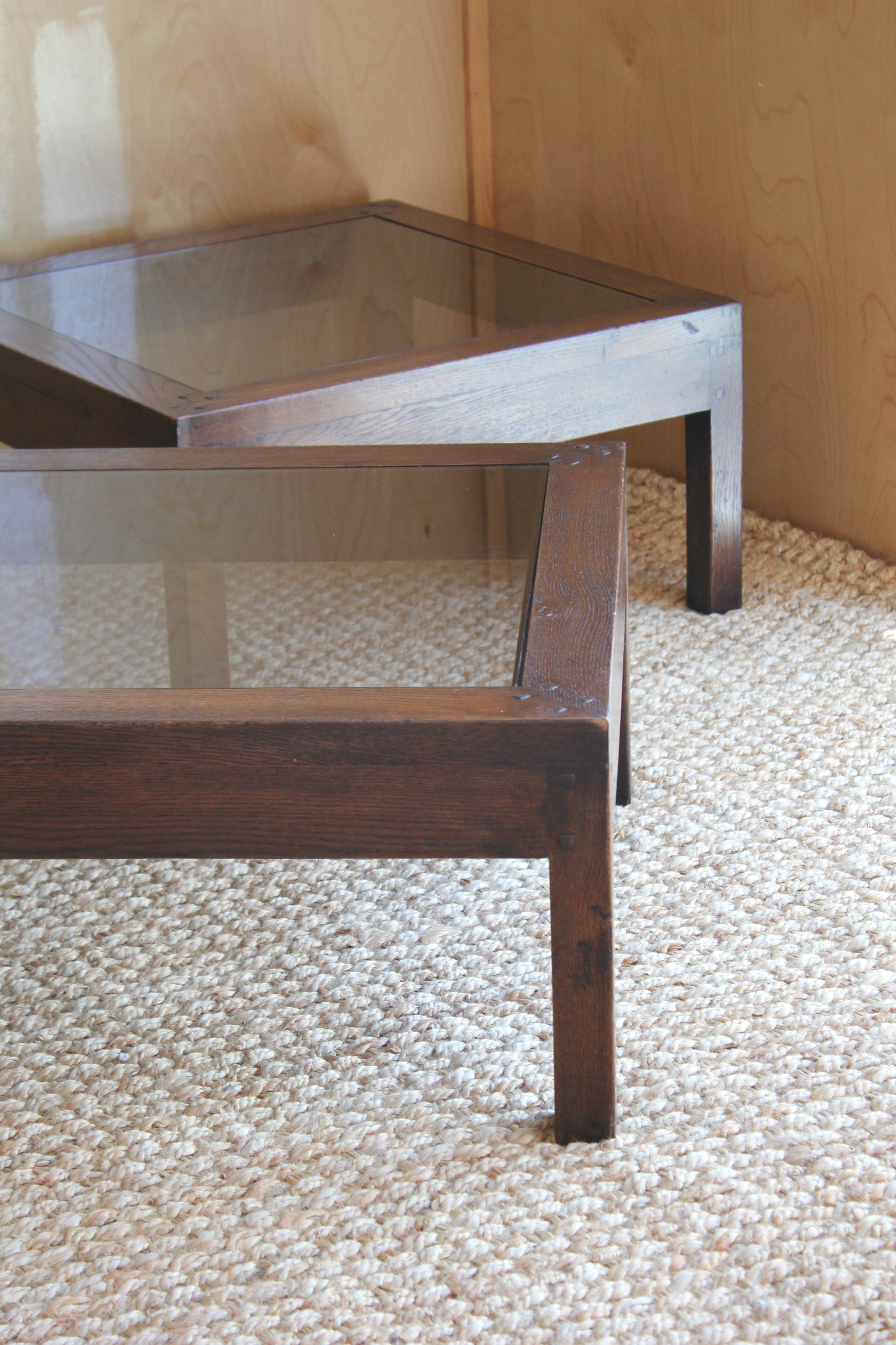 A solid pair of oak side tables with inset Smokey tempered glass tops. Simple, square proportions and warm timber grain give them a calm, practical presence that works as side tables beside a sofa or bed, or pushed together as a low coffee table.