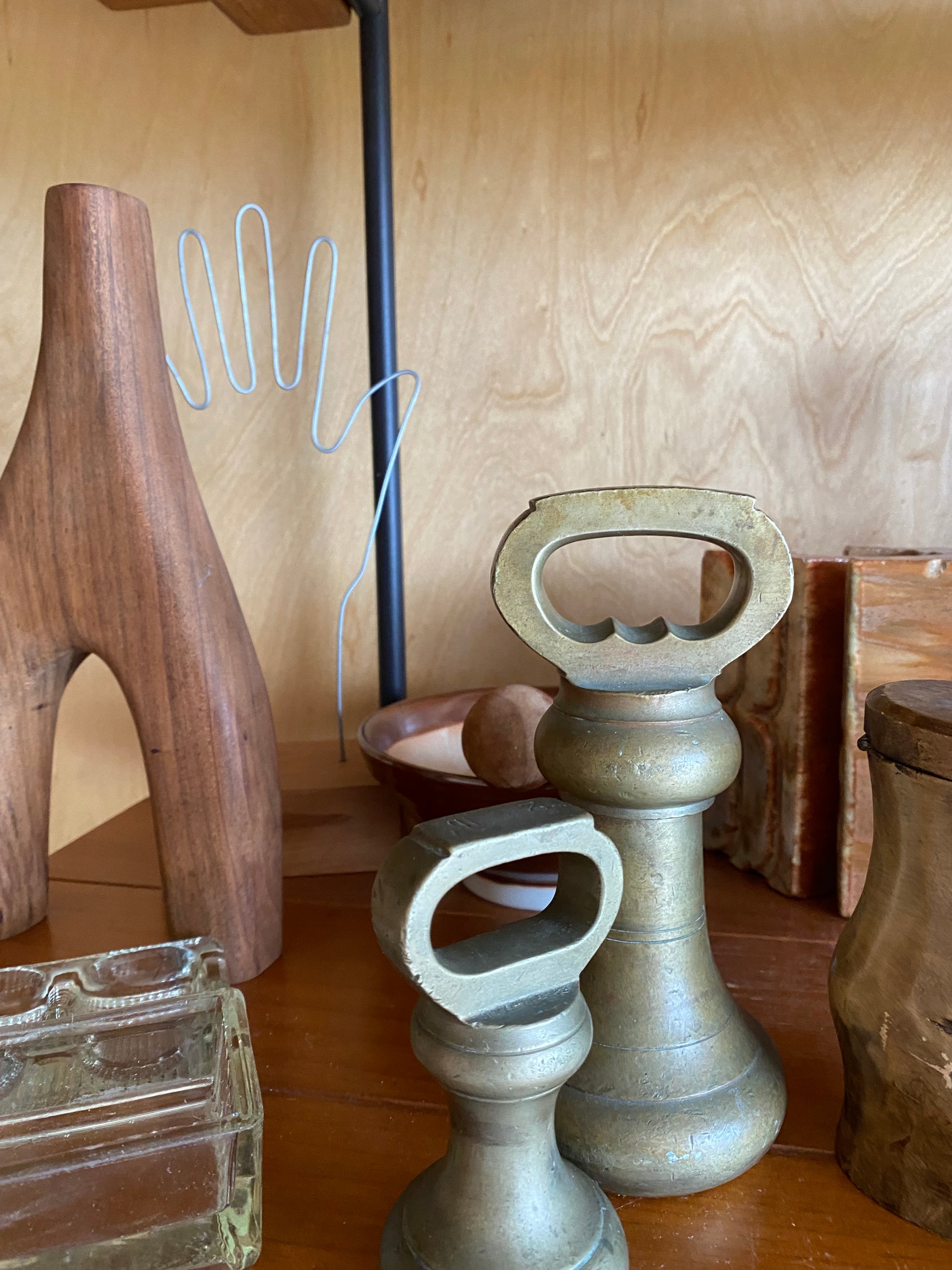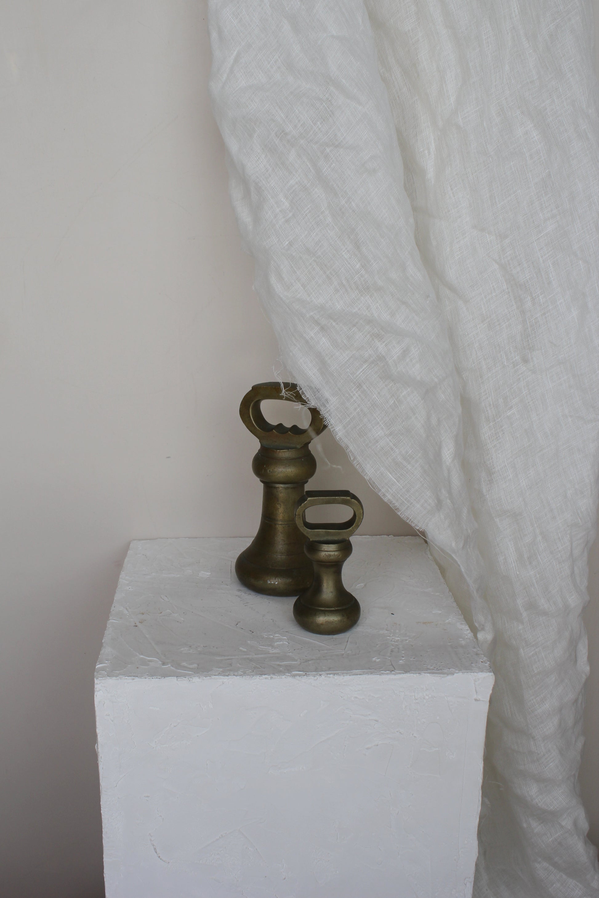 A handsome pair of solid brass bell weights with beautiful patina. Originally made as scale weights, they’ve since found many lives—as door stops, paperweights, bookends, or simply styled on a shelf. Their sculptural shape and rich brass tone make them both practical and decorative.