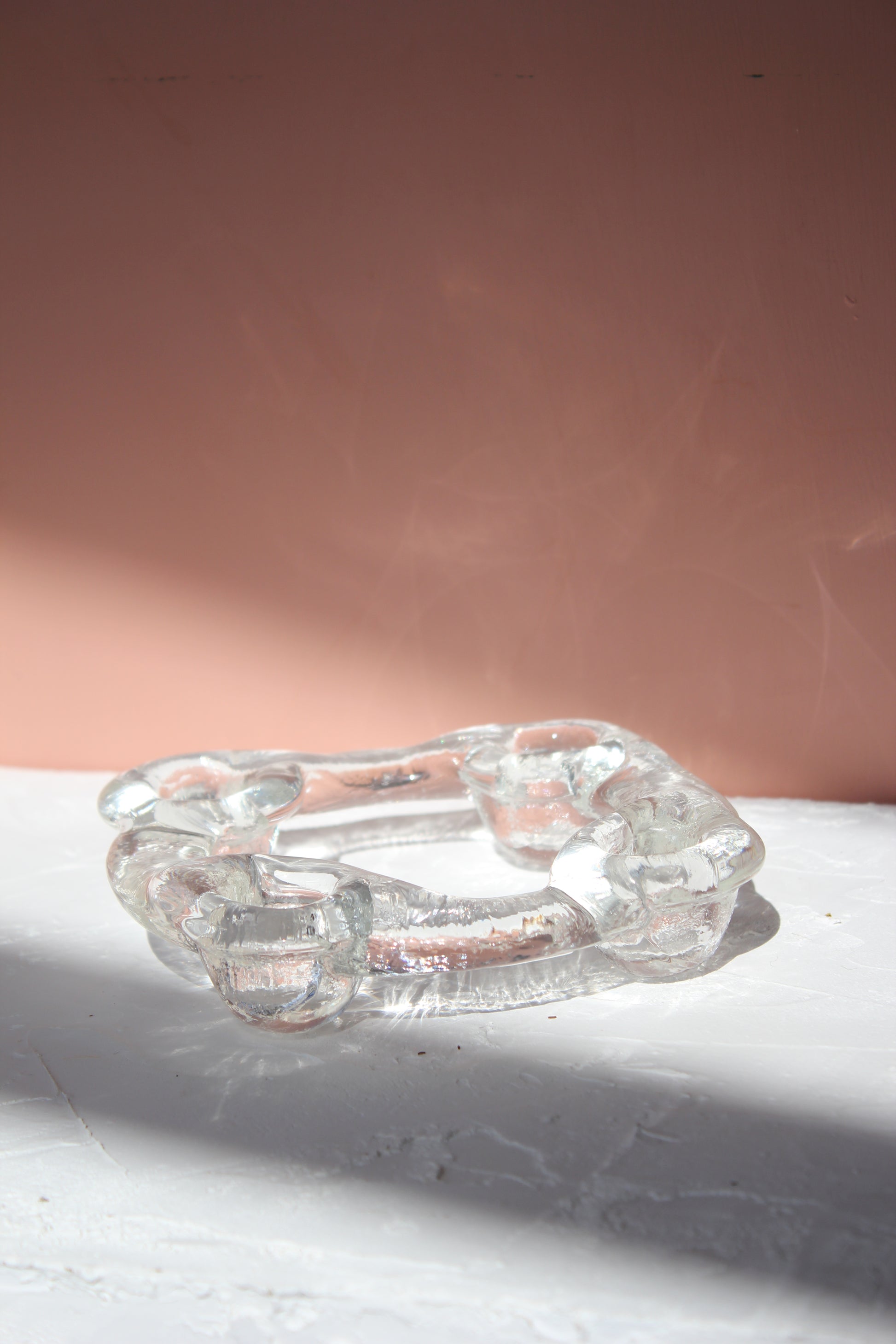 A sculptural Swedish ice glass candle holder attributed to Pukeberg Glasbruk. The thick, textured clear glass has a soft, molten quality that catches and reflects light beautifully, giving it presence whether used with candles or styled as an object on its own.