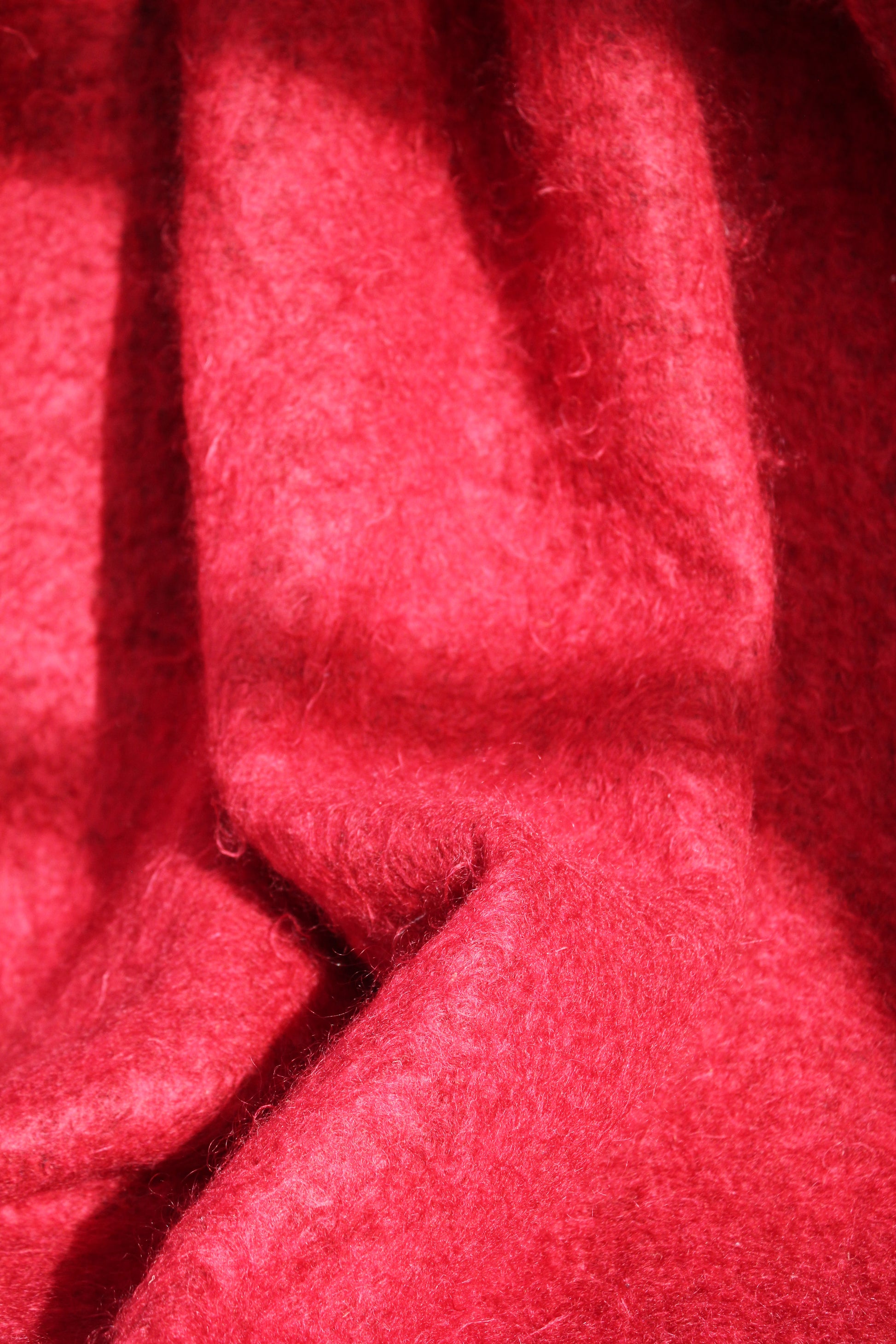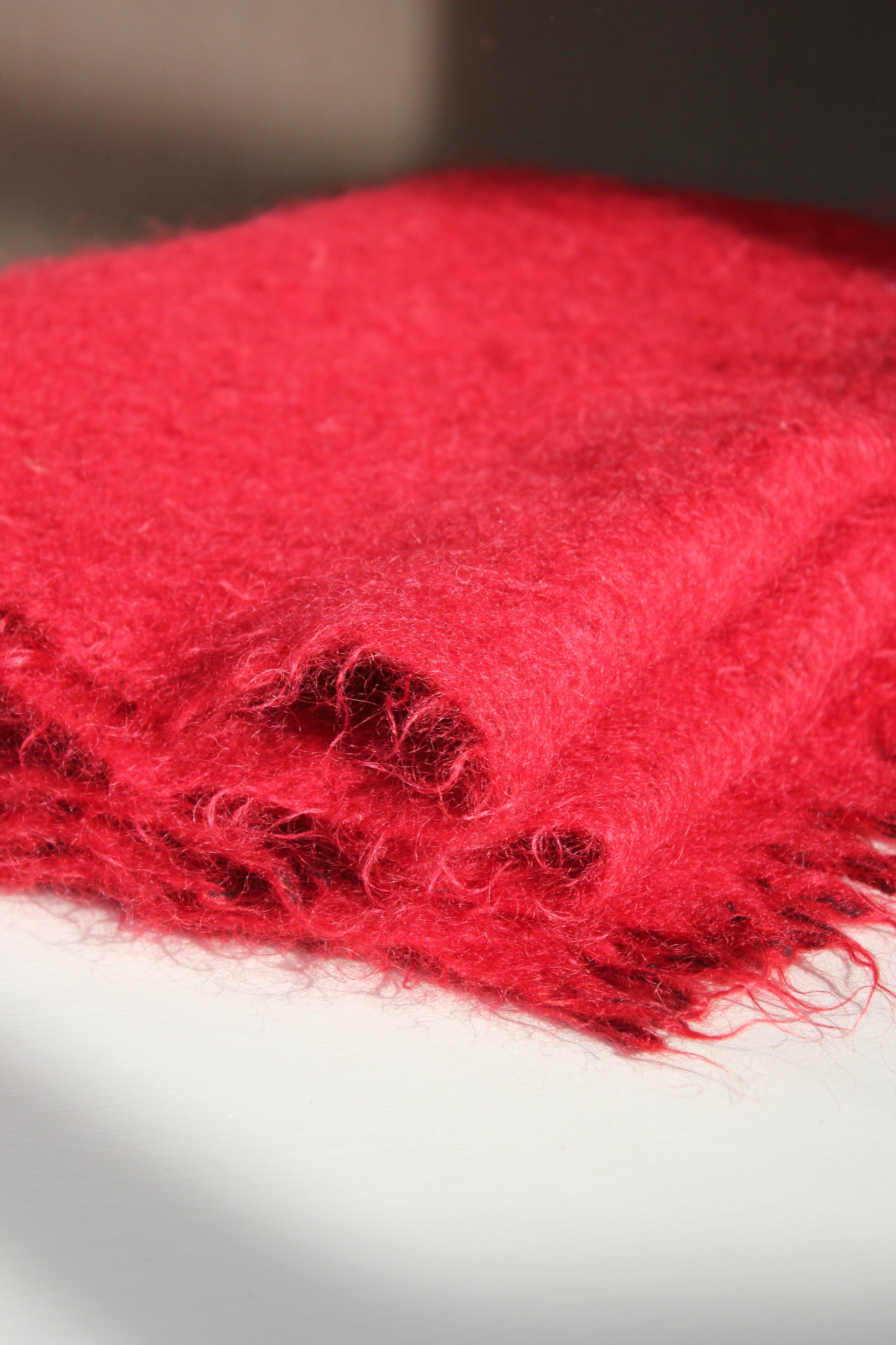 A richly coloured mohair throw in a deep, vibrant red with a soft, airy handle and subtle halo typical of mohair fibres. Lightweight yet insulating, it works beautifully draped over a sofa or chair, layered at the end of a bed, or even used as a small accent rug.