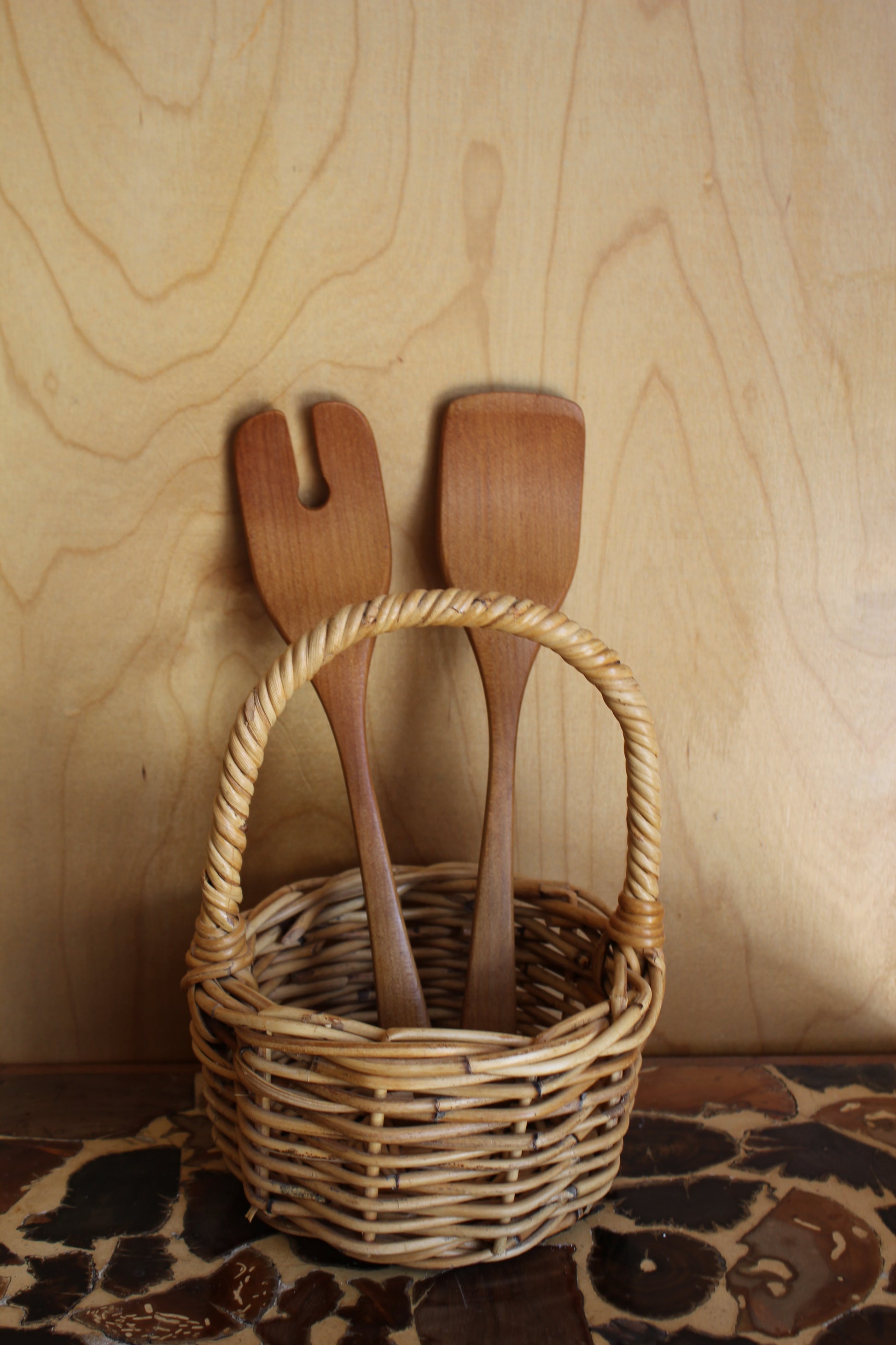A beautifully simple pair of wooden salad servers crafted from what appears to be solid rimu, with smooth, softly rounded heads and warm honey-toned grain. Unused and in excellent condition.