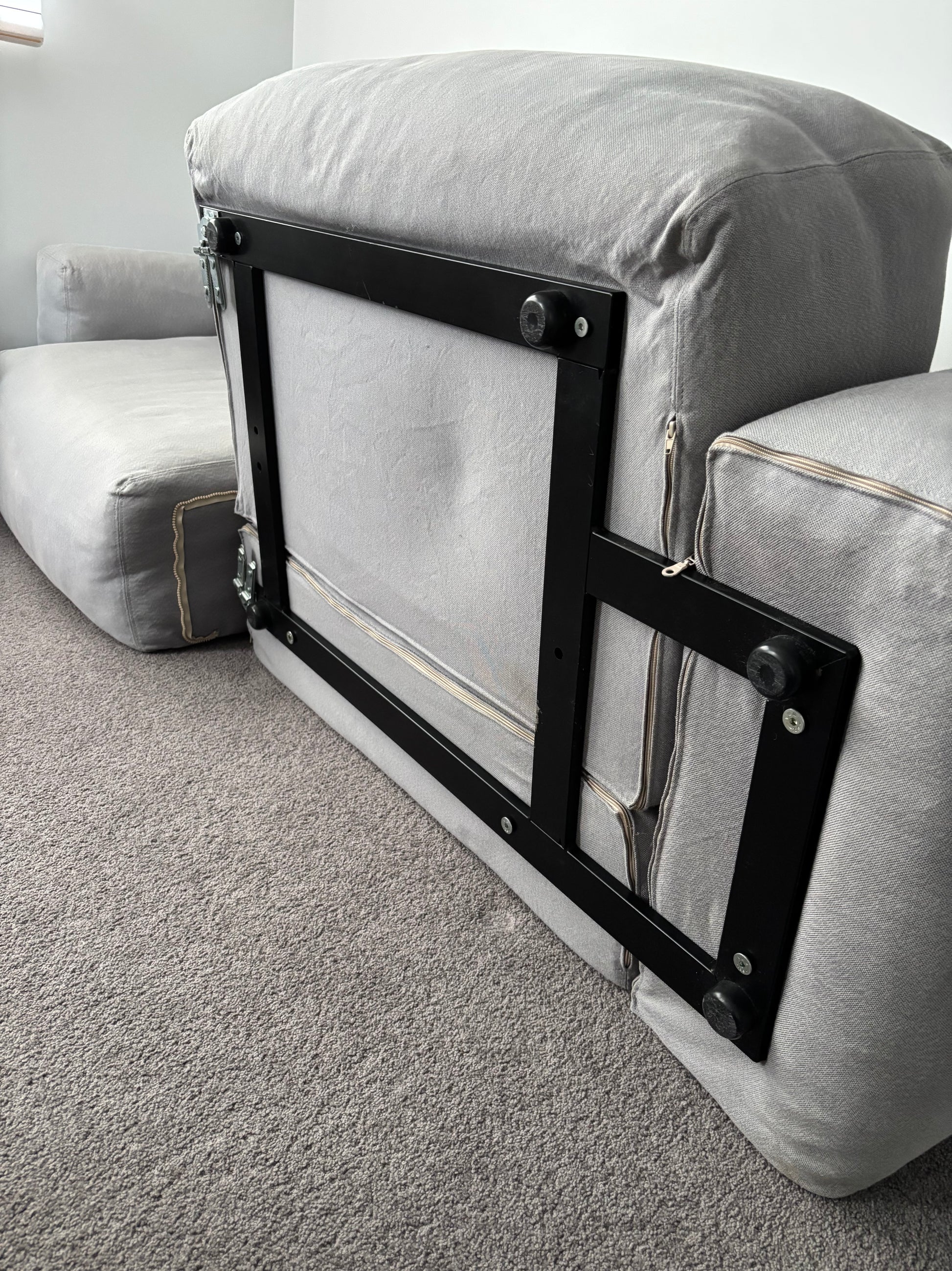 CONDITION / Good preloved condition with some fabric discolouration, a small lightened cleaning mark, and light sun fading to the arms. Structurally very solid. Images show quite accuratly, can also send video on request. Viewings available for serious buyers.